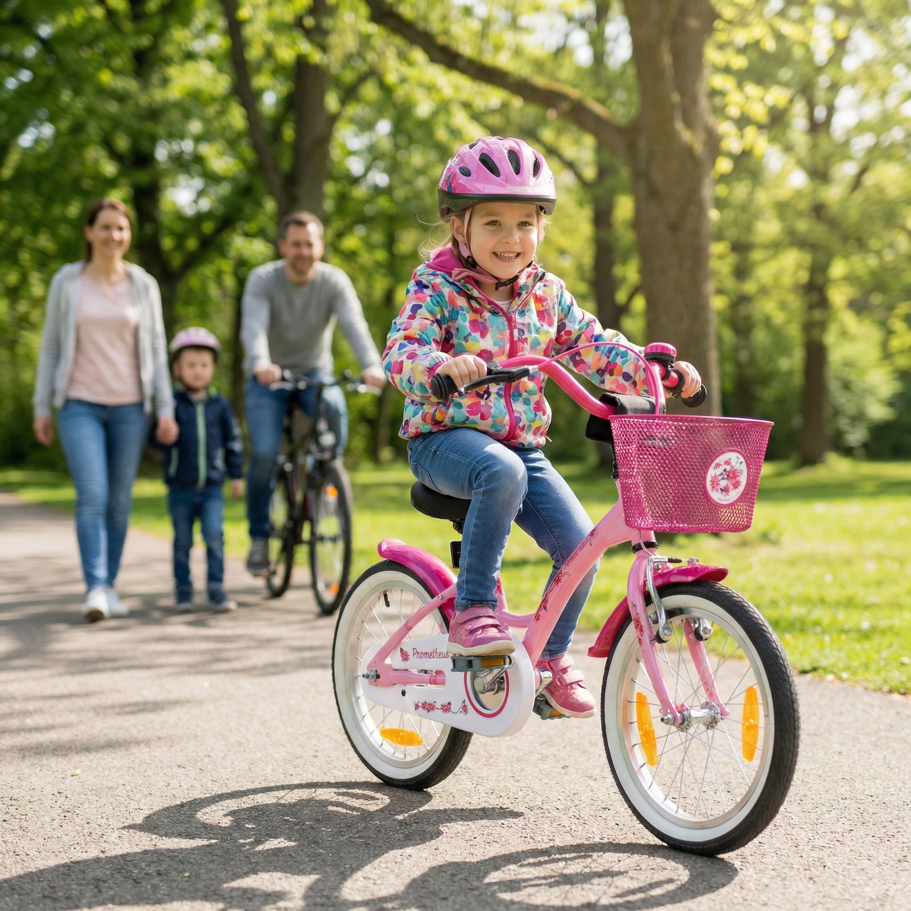Kettenschutz, Schutzblechen, abnehmbaren Stützrädern und extra großen Reflektoren rund um das Kinderrad.